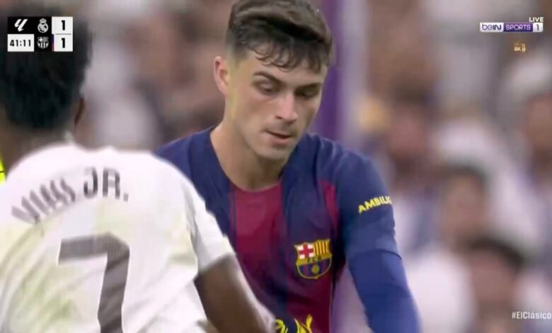 شاهد! بيدري لم يطيق الانتظار حتي نهاية الكلاسيكو لكي يطلب قميص فينسيوس فقام بهذا التصرف ليحصل عليه بالقوة وسط المباراة